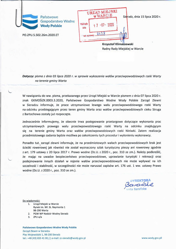 Odpowiedź na Interpelację Pana Krzysztofa Klimaszewskiego Radnego Rady Miejskiej w Warcie z dnia 3 lipca 2020 roku